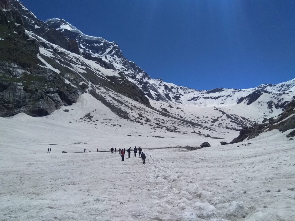 Once you reach the Bhrigu Lake at an altitude of 14,000 feet, your jaw will drop in awe! The crystal clear blue waters of the lake surrounded by snow-capped mountains are a sight to behold. Legend has it that Maharishi Bhrigu meditated here; hence it’s considered sacred by locals.